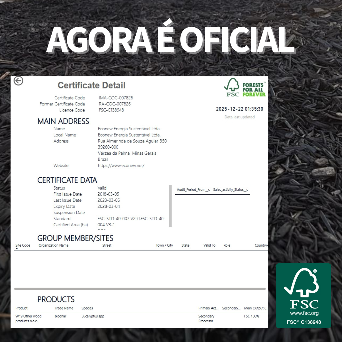 Temos orgulho em possuir a certificação do FSC® – Forest Stewardship Council® – organização mundial que promove o manejo florestal responsável, e em termos sido aprovados na avaliação preliminar da Puro.earth, organização internacional que emite créditos de remoção de carbono.